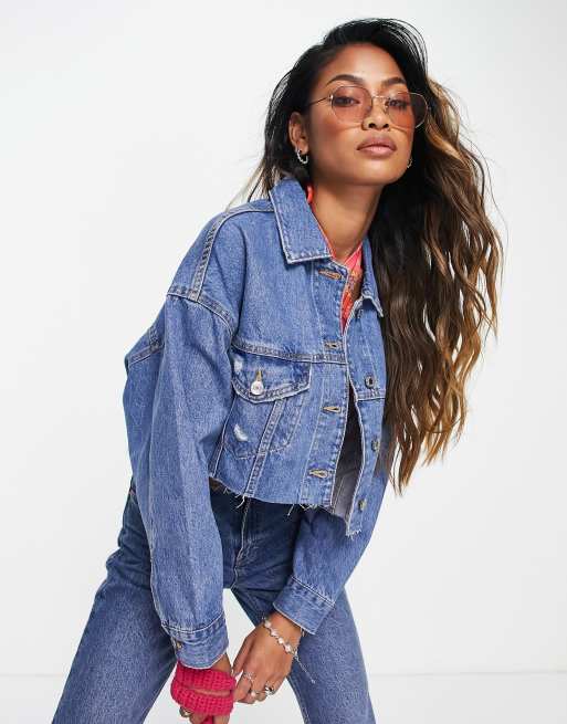 Bershka - Cropped denim jack met onafgewerkte zoom in lichtblauw