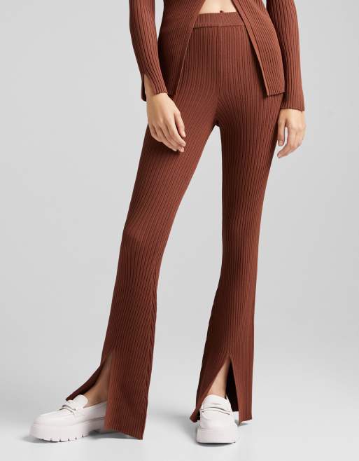 Bershka - Gebreide geribbelde broek met split in bruin