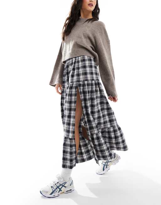 Bershka - Gelaagde geruite maxi rok in zwart en wit