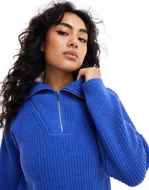 Bershka - Geribbelde gebreide trui met 1/4 rits in blauw