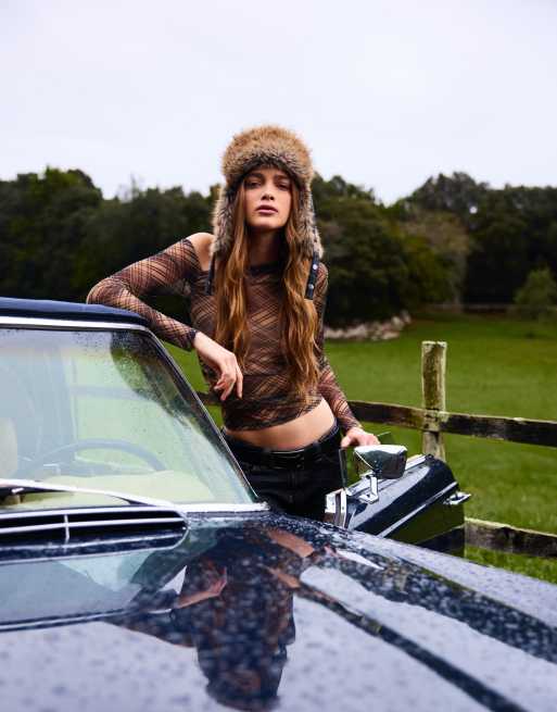 Bershka - Geruit T-shirt van tule met lange mouwen in zwart