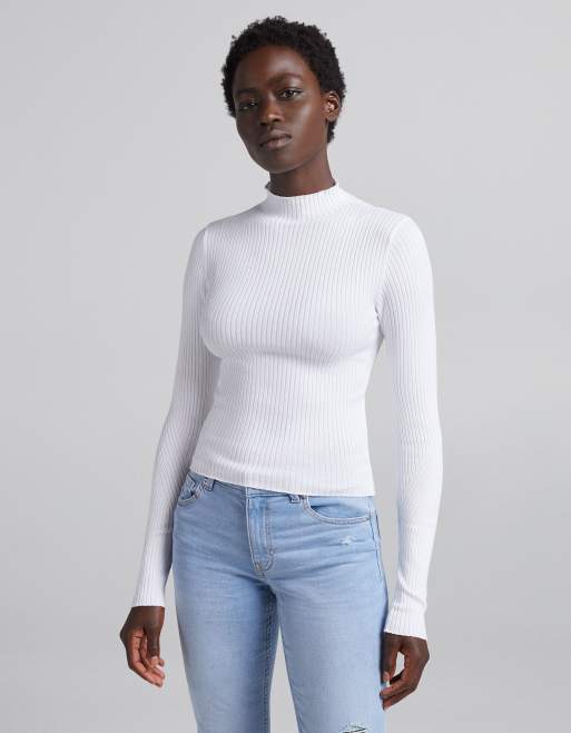 Bershka - Hoogsluitende, geribbelde trui in wit