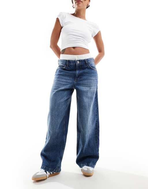 Bershka - Jeans met wijde pijpen en boxer-tailleband in blauw met donkere wassing