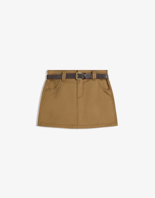 Bershka - Katoenen minirok met riem in lichtbruin