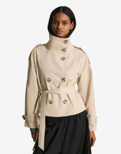 Bershka - Korte trenchcoat met opstaande boord in beige