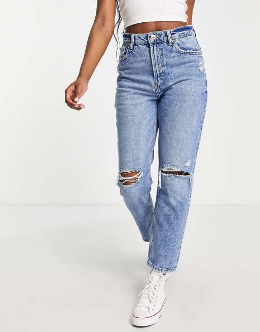 Bershka - Mom jeans met scheuren in blauw