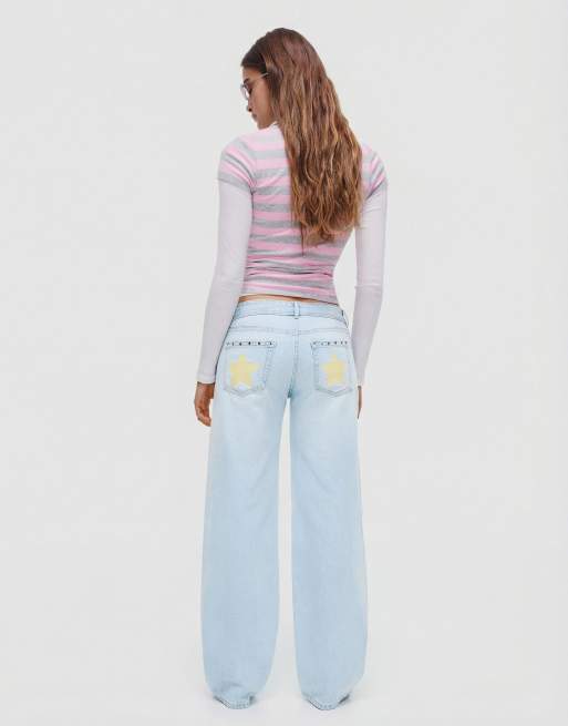 Bershka Petite - Baggy jeans met lage taille en studs in middenblauw