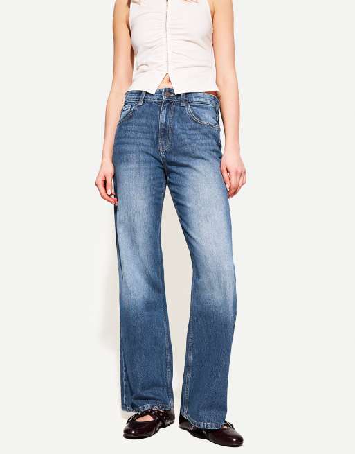 Bershka Petite - Jeans in jaren 90-stijl met wijde pijpen in denim blauw