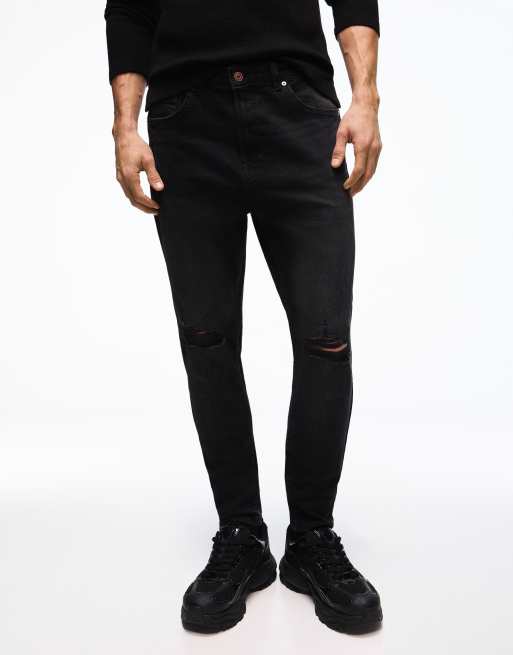 Bershka - Smaltoelopende jeans met scheuren in zwart