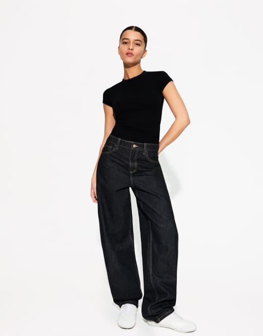 Bershka - T-shirt met korte mouwen en ronde hals in zwart