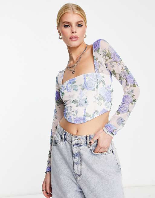Bershka - Top met lange mouwen en korsetdetail in bloemenprint
