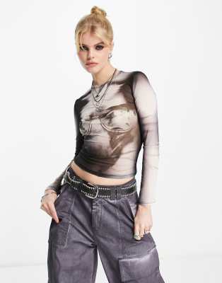 Bershka - Top van mesh met lange mouwen, digitale print en korset in zwart