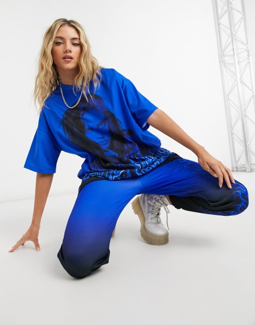 Bershka - x Billie Eilish - Oversized T-shirt en joggingbroek met grafische print in blauw, co-ord set
