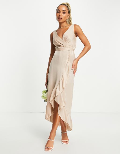 Blume - Bruidskleding - Satijnen midi jurk met overslag en ruches aan de rok in nertsbruin