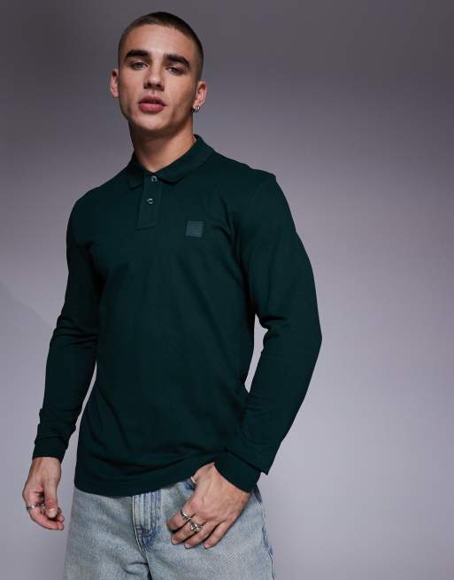 BOSS - Orange - Passerby - Slim-fit piqué polo met lange mouwen en logo in dezelfde tint donkergroen
