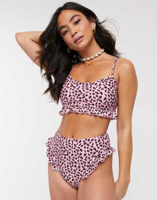 Brave Soul - Bikinibroekje met hoge taille en rucherand in luipaardprint in roze
