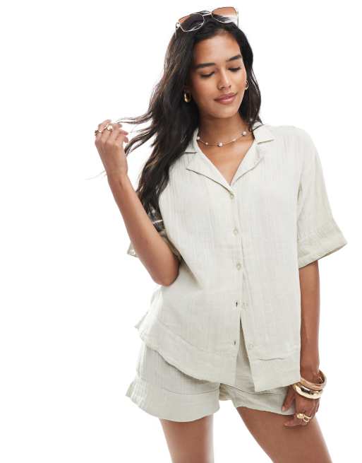 Brave Soul - Overhemd van katoen met textuur en korte mouwen in ecru, deel van co-ord set