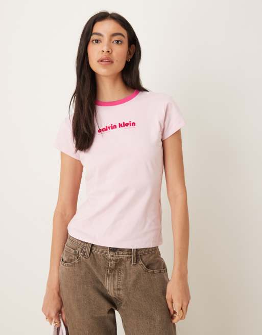 Calvin Klein Jeans - T-shirt met gekleurd randje en logo in roze