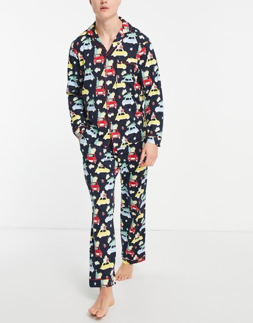 Chelsea Peers - Kerstmis - Pyjama met knoopsluiting in zwart met taxiprint