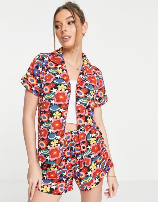 Chelsea Peers - Korte pyjamaset met retro bloemenprint in regenboogkleuren