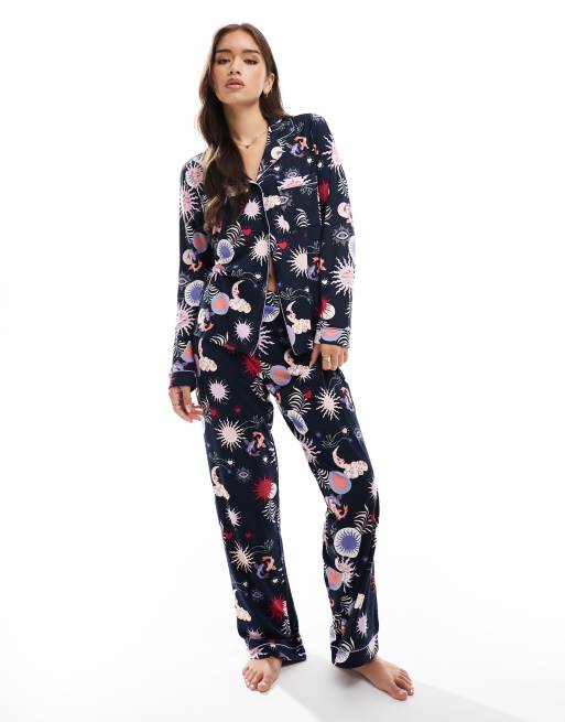 Chelsea Peers - Polyester pyjamaset met lange mouwen en reverskraag en broek in zonneprint