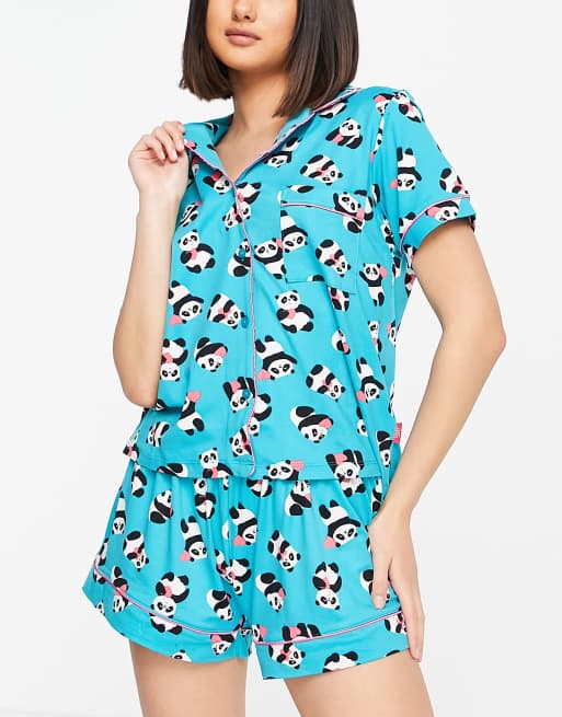 Chelsea Peers - Pyjamaset met overhemd met knoopsluiting en short met print van panda's met hartjes in blauw
