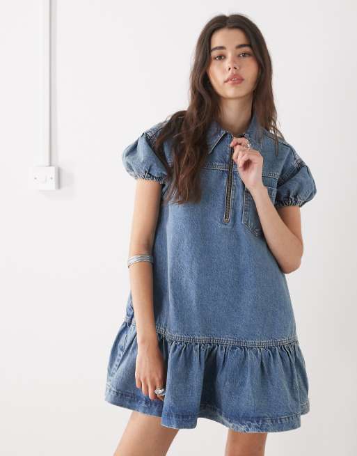 COLLUSION - Aangerimpelde denim mini jurk met korte mouwen in middenblauw