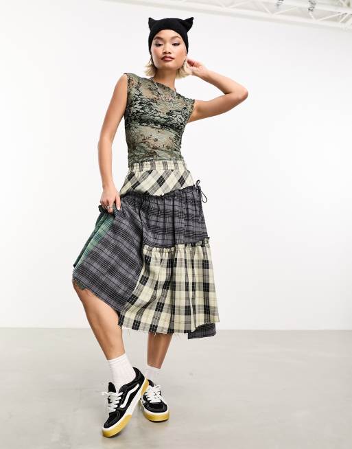 COLLUSION - Deconstructed midi-rok met mix van ruiten en aangerimpelde panden