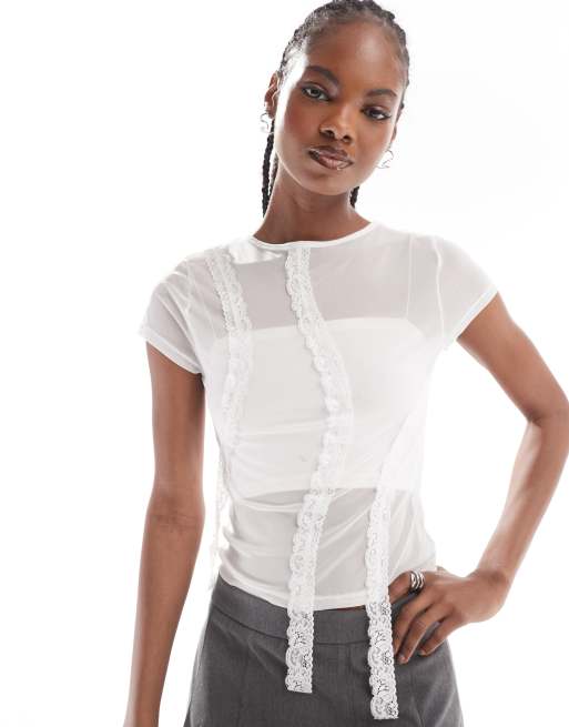 COLLUSION - Doorschijnend baby-T-shirt met kanten afwerking in ivoorwit