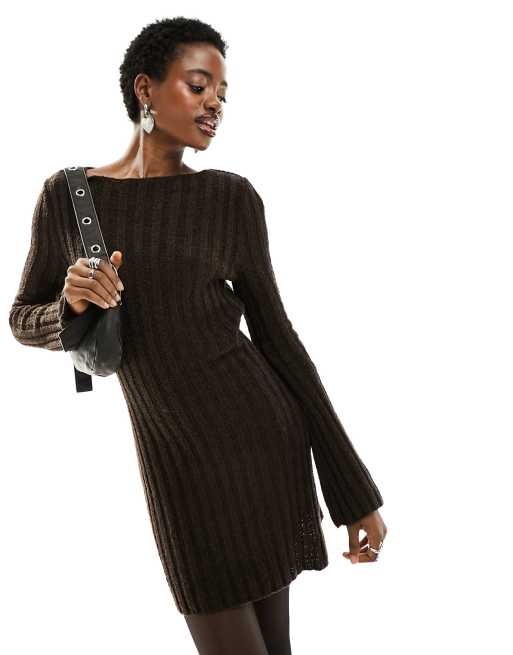 COLLUSION - Gebreide mini-jurk met textuur en rechte hals in chocoladebruin