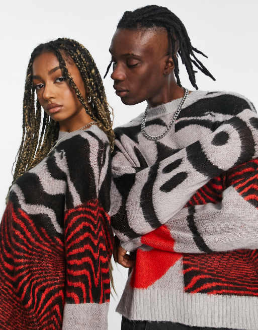 COLLUSION - Gebreide uniseks trui met patchwork in grijs, rood en zwart