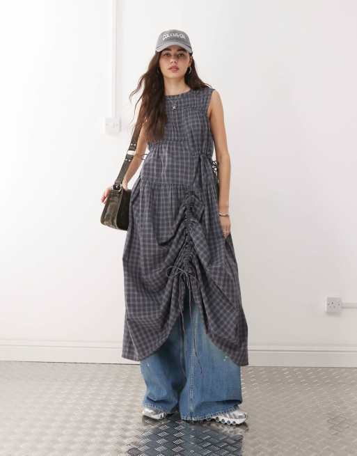COLLUSION - Geruite maxi jurk met meerdere trekkoordjes in grijs