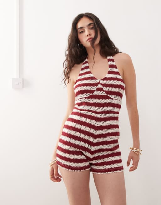 COLLUSION - Gestreepte playsuit met halternek in rood