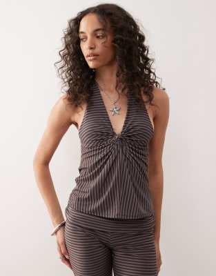 COLLUSION - Haltertop met knoop aan de voorkant in bruine strepen