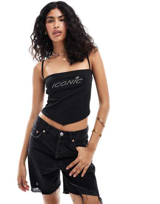 COLLUSION - Hemdje met vierkante hals, open achterkant en logo met diamantjes in zwart