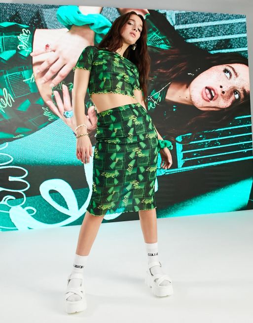 COLLUSION - Midirok van mesh met fotografische print in groen, deel van co-ord set