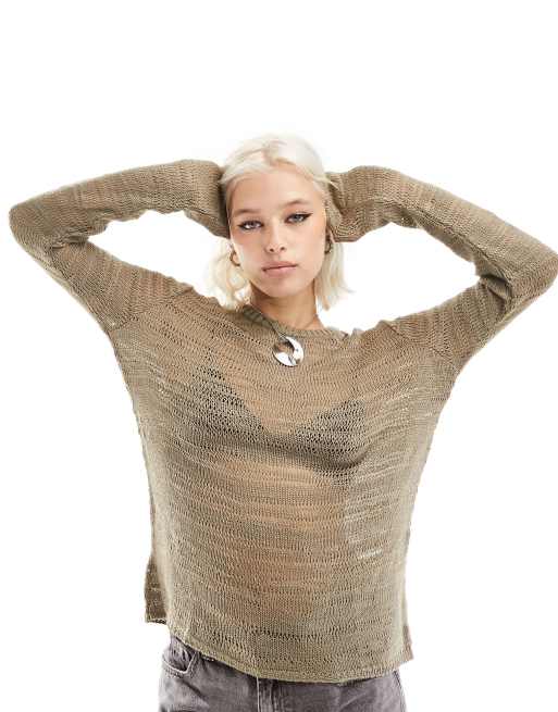 COLLUSION - Opengebreide trui met ronde hals in taupe