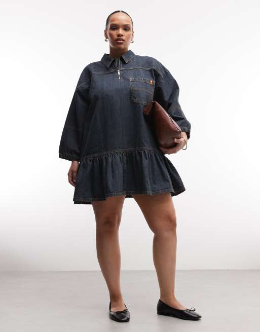 COLLUSION - Plus - Aangerimpelde denim mini jurk met pofmouwen in donkere wassing