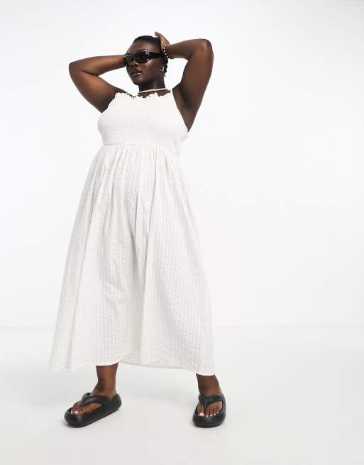 COLLUSION Plus - Zomerse maxi-smockjurk met gesmokt lijfje in wit