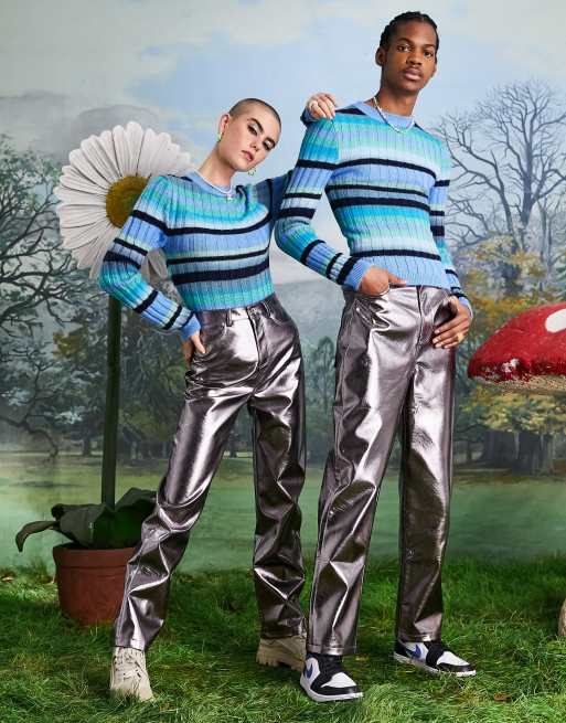 COLLUSION Unisex - Baggy broek van metallic imitatieleer met lage taille in gunmetal zilver