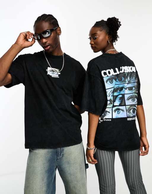 COLLUSION Unisex - Distressed t-shirt met fotoprint in zwart