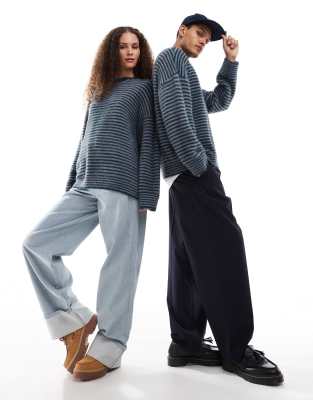 COLLUSION Unisex - Pluizige gestreepte trui met ronde hals in blauw