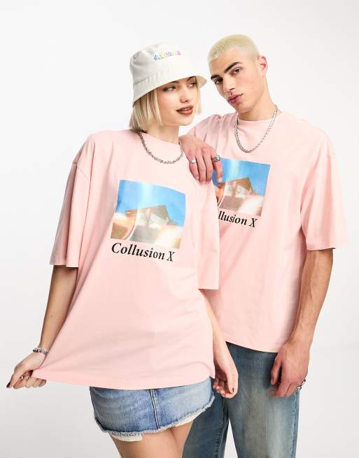 COLLUSION Unisex - T-shirt met fotografische print op de voorkant in roze