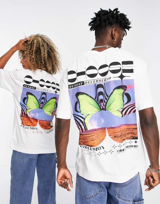 COLLUSION Unisex - T-shirt met vlinderprint in wit