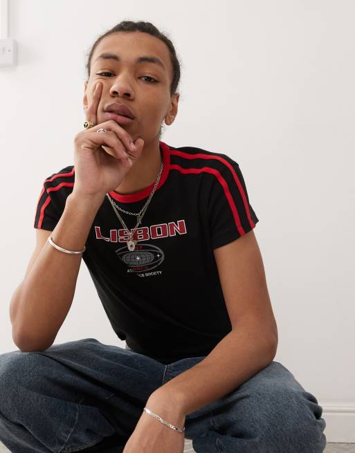 COLLUSION - Voetbalshirt met gekrompen pasvorm in zwart met Lisbon-print