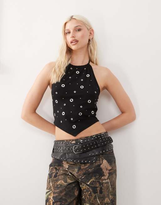 COLLUSION - Zwarte crop top met halternek en open rondjes