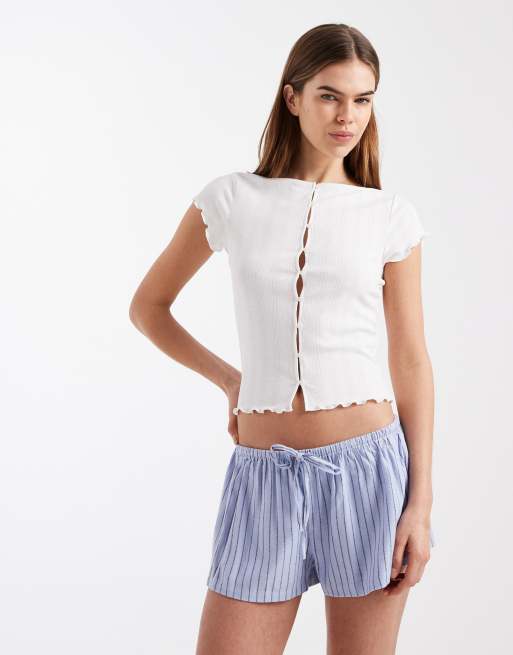 Cotton On - Gestreepte flanellen girlfriend short in blauw