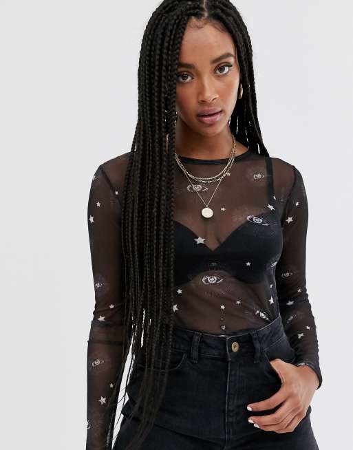 Daisy Street - Gekrompen top met lange mouwen met sterrenprint in mesh