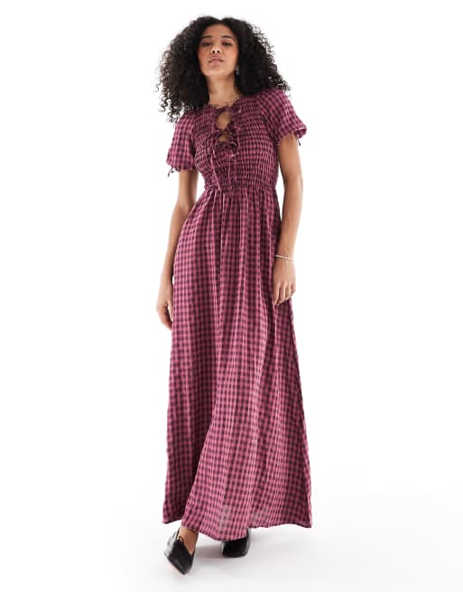 Daisy Street - Geruite maxi jurk met gesmokt lijfje en gestrikte voorkant in rood