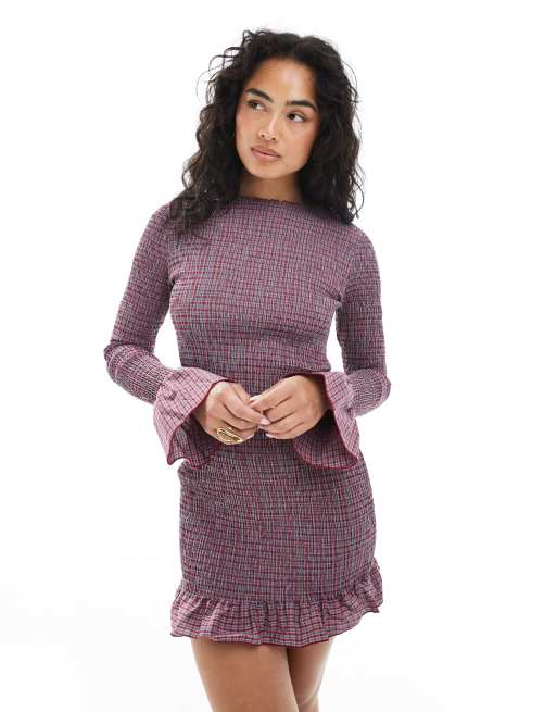 Daisy Street - Gesmokte mini jurk met lange mouwen in rode ruit